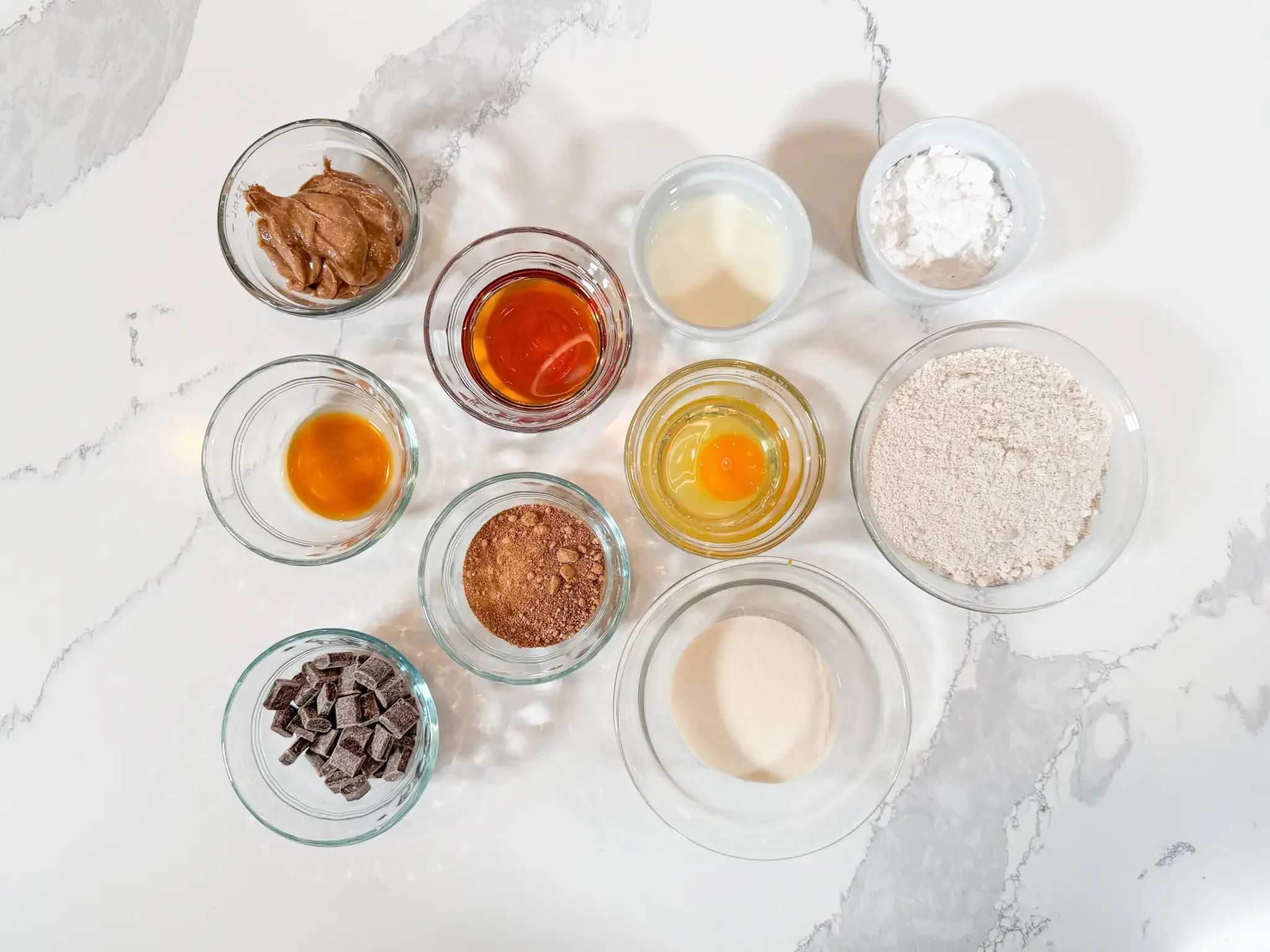 Whisk together melted butter/ghee, coconut sugar, and maple syrup. Add the nut butter, egg, vanilla, and raw milk. Whisk until glossy.